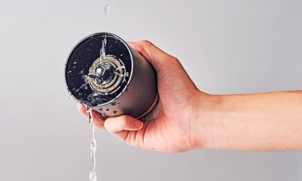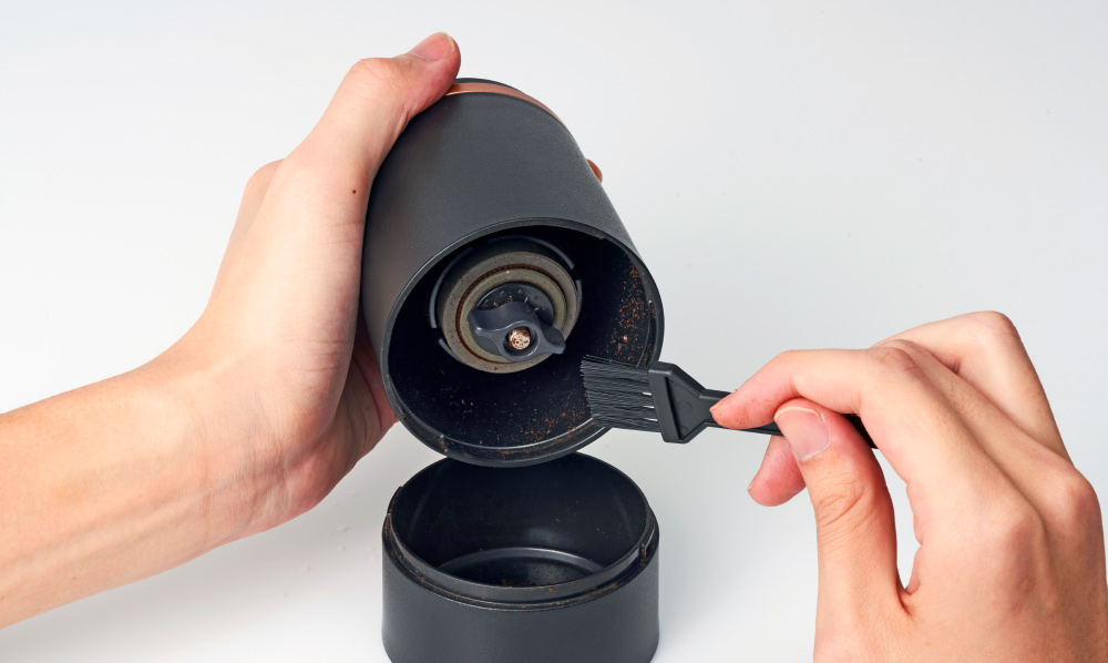粉受けケースの底面に滑り止めリングが付いているので、安定して挽くことができ、コーヒー豆が散らばらず移しやすくなっています。